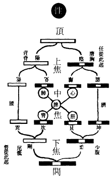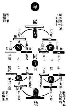 右图暑、热、燥三气,通乎天,从火也;湿、寒、风三气通乎地,从水也。暑者,阳之盛,乾也;乾为大赤,火之色也。热者,火之化,离也;燥者,阳之变,震也;震为决燥1;燥之为也。湿者,阴之盛,坤也;寒者,水之化,坎也;风者,阴之变,巽也。心、肺包络在上,属手经,自午至亥,六阴生於上,从上而走下。肝、脾、肾在下,属足经,自子至巳,六阳生於下,从下而走上。上以候外,浮以候气;下以候内,沉以候血,而诊法大要可知矣。