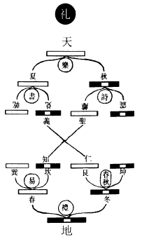 《豫》之《象》曰:雷出地奋,豫;先王以作乐崇德,殷荐之上帝,以配祖考。王者功成,治定三纲,正九畴叙,百姓和洽,乃作《乐》以宣八风之气,立春,艮为条风,亦云融风。春分,震为明庶风,亦云谷风。立夏,巽为清明风。夏至,离为景风,亦云凯风。立秋,坤为凉风。秋分,兑为闾阖风。立冬,乾为不周风。冬至,坎为广莫风。以类万物之情。天地之气,感而太和,气至之应,不爽时刻,故造律之法,先定中声,以立其本,以次递互,损益相生,终於十二,而得三统之义焉。天开於子,子为天统,积阳为天。阳数始於一,究於九。九者,阳之用,故黄钟之律管长九寸三分。《损》一下生林钟未。未者,丑之冲也。地辟於丑,丑为地统,积阴为地。阴数始於二,中於六。六者,阴之用,故林钟之律管长六寸三分。《益》一上生太簇寅。人生於寅,寅为人统。人者,阴阳之交,参於三,合於八,故太簇之律管长八寸。八者,伏羲氏之所以画八卦,顺天地,通神明者也。三统相通,三正迭用,阳律娶妻,阴律生子,六律六同,历辰十二,还相为宫,而其义为无穷矣。(《周官》大师掌六律、六同,以合阴阳之声。黄钟、大簇、姑洗、蕤宾、夷则、无射,阳声也。大吕、应钟、南吕、林钟、小吕、夹钟,阴声也。盖日月会於十二,次而右转,圣人制六同以象之。斗柄运於十二辰而左旋,圣人制六律以象之。六律,阳也,左旋以合阴。六同,阴也,右转以合阳。同位者,象夫妇。异位者,象子母。本乎乾爻者,为六律。本乎坤爻者,为六同。六律左旋而生同,同为同位,所以象夫妇。六同右转而生律,为异位,所以象子母。间八而生,所以象八卦。旋之5为官,所以象三才。)阳道常饶,自子至巳,阳之道也,其管皆长。阴道常乏,自午6至亥,阴之行也,其管皆短。由是节之以五声,长者声下,短者声高,下者重浊而舒迟,高者轻清而剽疾。宫为君,君者主也,居中以畅四方。唱始施生,为四声纲,故声中於宫,触於角,祉於徵,章於商,宇於羽。(和平沉厚,粗大而下者,宫声也。劲凝明违,从上而下归於中者,商声也。圆长通彻,中平而正者,角声也。抑扬流利,从下而上归於中正者,徵声也。䁏䁏而远彻,细小而高者,羽声也。《传》曰:闻宫音使人温舒而广大,闻商音使人方正而好义,闻角音使人恻隐而爱人,闻徵音使人乐善而好施,闻羽音使人整齐而好礼。)宫为君,商为臣,角为民,徵为事,羽为物。(宫无为以覆物,君之象也。商有为而通物,臣之象也。角善触而难驭,民之象也。徵出无而验有,事之象也。羽因时而翕张,物之象也。宫为君足以御臣,商为臣足以治民,角为民足以兴事,徵为事足以成物,羽为物足以致用。此其序也。)本之以五行金、木、水、火、土,揆之以五则规、矩、权、衡、绳,正之以五事貌、言、视、听、思,播之以八音金、石、丝、竹、匏、土、革、木,经之以八卦,而天施地化,人事之纪备矣。故夫黄钟之长,十分为寸,十寸为尺,十尺为丈,十丈为引;分、寸、尺、丈、引五度审而长短定。以之审量,则黄钟之管九寸,其中容秬黍千二百粒以为龠。十龠7为合,十合为升,十升为斗,十斗为斛;龠、合、升、斗、斛五量审而多少均。以之平衡,则黄钟所容千二百黍,其重十二铢,两龠则二十四铢,八卦二十四爻。为一两,十六两为一斤,三百八十四铢,六十四卦三百八十四爻。三十斤为一钧,万有一千五百二十铢。二篇之策,万有一千五百二十。四钧为石;铢、两、斤、钧、石五权谨而轻重平矣。故律者顺乎天地,本乎阴阳,应乎人伦,原乎情性;风之以德,感之以乐,故民莫不同一而天下化成矣。(《乐书》曰:人受天地之中以生,莫不钟五行之秀,性五常之德。其化之也,不过以五声之和达五常之性而已。故闻宫音,斯达诚实之心以为性;闻徵音,斯达恭敬之心而为礼;闻商音,斯达羞恶之心而为义;闻羽音,斯达是非之心而为智;闻角音,斯达恻隐之心而为仁。夫如是,则乐行而伦清,外则耳目聪明,内则血气和平,移风易俗,天下皆宁矣。)