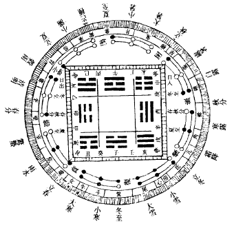 夫四时之气,由乾坤、阖辟、动静、阴阳、升降、消息使之然也。冬至阴极生阳,夏至阳极生阴,乾坤、阴阳之合也。秋分阴之中,坤之阖;春分阳之中,乾之辟。冬、夏二至,阴阳合也。春、秋二分,阴阳离也。按图而观,义斯可见。是故揆之卦画,验之天时,以冬至前后各三十日为一节;小雪至大寒。春分前六十日为一节,大寒至春分。后六十日为一节,春分至小满。夏至前后各三十日为一节,小满至大暑。秋分前六十日为一节,大暑至秋分。后六十日为一节,秋分至小雪。六六凡三百有六十日。外卦巽温、乾热、震凉、坤寒,天地四时之正气也。中央坎、离、艮、兑四卦,配为雨、旸、燠、寒、风;天地四时之游气也。游气纷扰,参差不齐,五者来备,各以其时,则百谷用成,庶草蕃庑,休征类应。极备极无,则百谷用不成,咎征变见。唯圣人在位,致中和以成其位育之功,则五事修而天人应,感之几微矣。