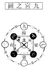 右五、十中交九宫之叙,即洛书之数也。一、三、九、七,天数也。天数奇,奇之象圆,参於三,其数左旋,始於一,居于正北;一三如三,故三次于正东;三三如九,故九次于正南;三九二十七,故七次于正西;三七二十一,而复于一。二、四、八、六,地数也。地数偶,偶之象方,两於二,其数右转,起于西南;二二如四,故四次於东南;二四如八,故八次于东北;二八十六,故六次于西北;二六十二,而归于二。此阴阳左右运行自然之妙,而二、七、四、九易位,与河图不同者也。《内经》曰:天数始於一,终於九焉。一者天,二者地,三者人。三而成天,三而成地,三而成人。三而三之,合则为九,九分为九野:正北曰冀州,今大都、燕南、河间、平阳等路。正东曰青州今益都、沂密、登莱等州。正南曰扬州,今两淮、两浙、江东、江西、瓯闽等处。正西曰梁州,今川蜀、云姚等处。正中曰豫州,今河南、襄阳等处。东北曰兖州,今济南、东平、东昌、济宁等处。东南曰徐州。今徐、邳、宿、亳等州。西南曰荆州,今荆潭、湖广等处。西北曰雍州。今陕西、甘肃等处。是故神禹别之而作《贡》,箕子演之而叙《畴》。他如运气、太乙、阴阳、医家者流,虽纯驳不同,要皆不出乎此九宫之数也。