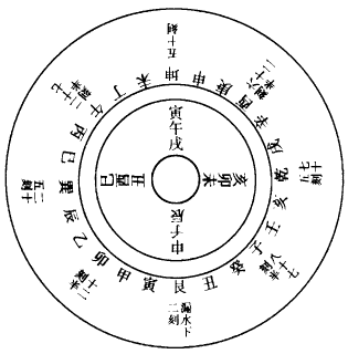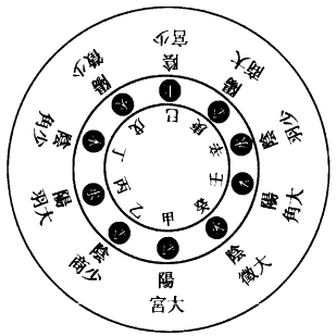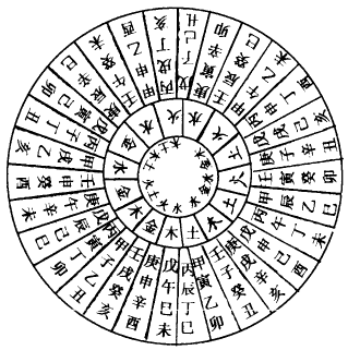 十干、十二支相承,共成六十日,乃天地之纪,符会以统日焉。甲,东方,春始生,为时之长子,北方阳始生,为气之先,则甲子为首,而乙丑次之,然辰之中,交相参同,则五行互以临遇,无一专致其统矣。又有纳音之法,乃旋相为宫之法也,正与律吕之用同。而一辰之中,又含五音,十二辰共纳六十音也。谓如子之一辰,甲子金、丙子水、戊子火、庚子土、壬子木是也。按《汉志》同类娶妻,隔八生子者,此纳音法也。同类娶妻,谓甲阳之干,子阳之辰,上下相临皆阳,则亢而无以兆其和,故娶乙丑为妻,乙丑干辰皆阴也。余位并同。隔八生子,谓甲子前八位,下生壬申金,又隔八生庚辰金三位,然后左行向火,至火依前隔八生火,火三下生而后至木,木三下生而后至水,水三下生而后至土,土三下生而后至金,乃为一周。复自甲午上生金,依次而转。然隔八生子,则除上下两位而言也。隔八,非第八也。若自甲子至癸酉通数之,乃共十矣,此周甲之气耳。纳音之所以金先者,则五行之中,唯有金声,铸而为器,则音声彰矣。《白虎通》曰:锺,兑音也,感之於人则成肺,亦为五藏,先以主音,声外应皮毛坚而响,亦由金之化也。至秋肃杀万物,坚燥而风劲凄鸣,乃金之性也。反於自东右行向南,五音始西而右行向南,阳生於子,所以下生,阴生於午,所以上生。夫上下生者,正谓天气下降,地气上升。《易》曰天地交泰,义见此也。然所生止三者,亦三元之义,故经曰三而成天,三而成地,三而成人,《易》爻之象取三,《老子》曰一生二,二生三,三生万物,即其意也。盖有始、有中、有终,毕矣。五音变而周,乃十二辰各舍五音,则成三十位而遍六十甲子也。故经曰:阴阳相错,变由生也。又曰:高下相召,升降相因,而变作矣。此之谓也。