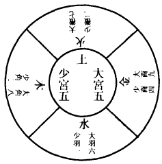 五音者,五行之音声也。土曰宫,金曰商,木曰角,火曰徵,水曰羽。在阳年则曰太,在阴年曰少。《晋书》曰:角,触也,象诸阳气触动而生其位,丁壬岁也。徵,止也,言物盛则止其位,戊癸岁也。商,强也,谓金性之坚强其位,乙庚岁也。羽,舒也,阳气将复,万物孳育而舒生其位,丙辛岁也。宫,中也,中和之道,无往而不理,又总堂室奥阼而谓之宫。所图不一,盖土亦以通贯於金木水火,王於四季,荣於四藏,皆总之之意也,其位甲己岁也。故五运从十干起,甲为土也;土生金,故乙次之;金生水,故丙次之。如此五行相生而转,甲为阳,乙为阴,亦相间而数,如环之无端。详其五音五运之由,莫不上下相召,小大相乘,同归於治而已。是故因刻以成日,因日以成月,因月以成岁,递相因以制用。虽太古占天望气,定位之始,见黅天之气横於甲己为土运,素天之气横於乙庚为金运,玄天之气横於丙辛为水运,苍天之气横於丁壬为木运,丹天之气横於戊癸为火运,则莫不有从焉。若以月建之法论之,则立运之因,又可见也。何哉?丙者火之阳,建於甲己岁之首,正月建丙寅,丙火生土,故甲己为土运,戊者土之阳,建於乙庚岁之首,正月建戊寅,戊土生金,故乙庚为金运。庚者金之阳,建於丙辛岁之首,正月建庚寅,庚金生水,故丙辛为水运。甲者木之阳,建於戊癸岁之首,正月得甲寅,甲木生火,故戊癸为火运。壬者水之阳,建於丁壬岁之首,正月得壬寅,壬水生木,故丁壬为木运。是五运皆生於正月建干,岂非日月岁时相因而制用哉。