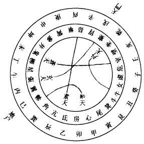 天地支干相错,而列於八方,各有定位,星宿环列,垂象於其上,而各有分野,故太古占天望气,以书於册,垂示后人,在精意以考之,而后可明也。盖天分五气,地列五行,五气分流,散於其上,经於列宿,下合方隅,则命之以为五运。丹天之气经於牛、女、奎、璧四宿之上,下临戊癸之位,立为火运。黅天之气经於心、尾、角、轸四宿之上,下临甲巳之位,立为土运。素天之气经於亢、氐、昴、毕四宿之上,下临乙庚之位,立为金运。玄天之气经於张、翼、娄、胃四宿之上,下临丙辛之位,立为水运。苍天之气经於危、室、柳、鬼四宿之上,下临丁壬之位,立为木运。此五气所经二十八宿,与十二分位相临,则灼然可见。因此以纪五天而立五运也。戌为天门乾之位也,巳为地户巽之位也,自房至毕十四宿为阳主昼,自昴至心十四宿为阴主夜,通一日也。