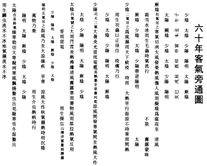 司天在泉,四间气纪步,各主六十日八十七刻半,客行天令,居於主气之上,故有温凉寒暑、曚暝明晦、风雨霜雪、电雹雷霆不同之化。其春温、夏暑、秋凉、冬寒,四时之正令,岂能全为运与气所夺,则当其时自有微甚之变矣。布此六十年客气旁通,列於主位之下者,使知其气之所在大法也。其天符、岁会、平气、支干逆顺,气与运相生相克,客胜主胜,灾化分野,交时先后,淫胜郁复,嘉祥灾变,各各不同,则经与《玄珠》皆备见之。审天时,占气候,若符契之相合也。而六气极则过亢,灾害生矣,故气极则反由是所乘之气,居下以乘之,经所谓相火之下,水气承之者是也。又有中见之气从之,经所谓少阳之上,火气治之,中见厥阴是也。盖阳极则阴生,阴极则阳生,斯五行相济之妙用也。其中见者,乃手足经六合藏府相乘之化者是也,在天地间,则气自应之矣。