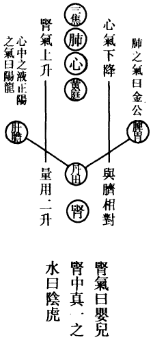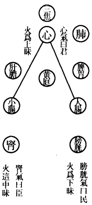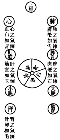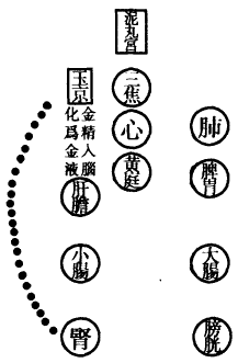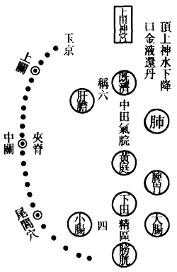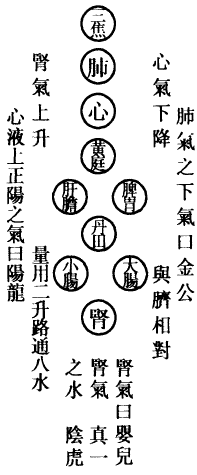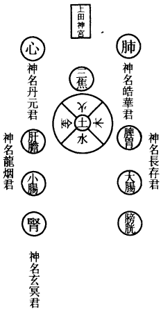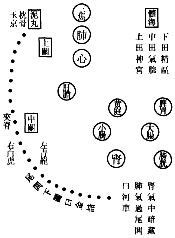 肺为华盖,咽喉为重楼,口为玉池兑户,鼻为天门天柱,眉间为玉堂,额为天庭,顶为天宫,耳为双市门。肾气传肝气,肝气传脾气,脾气传肺气,肺气传心气,心气传脾气,脾气传肾气,是为五行循环,而曰小还丹也。上田入中田,中田入下田,三田返复,而曰大还丹也。