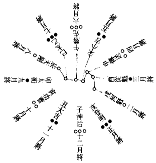 冬至之月,一阳始生而成复卦。大寒之日,二阳始生而成临卦。雨水之日,三阳始生而成泰卦。春分之日,四阳始生而成大壮卦。谷雨之日,五阳始生而成夬卦。小满之日,纯阳而成乾卦。夏至之日,一阴始生而成姤卦。大暑之日,二阴始生而成遁卦。处暑之日,三阴始生而成否卦。秋分之日,四阴始生而成观卦。霜降之日,五阴始生而成剥卦。小雪之日纯阴,坤卦用事。所谓损之而益,益之而损也。