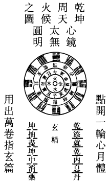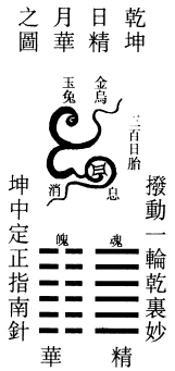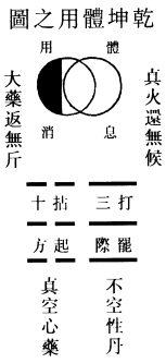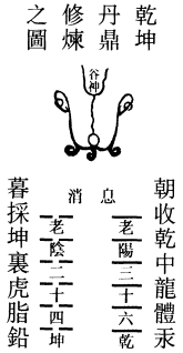 夫丹之图,自体用乾坤而流出,丹鼎乾坤而消息。一十二爻,阴遇阴变二数,故老阴二十四;阴遇阴3变三数,老阳三十六。修行之人,按鼎内之修乾息之气,煅坤消之精,以阳炼阴成丹也。