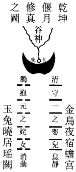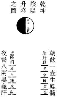 夫乾坤升降阴阳之图,自偃月炉中而流出。乾坤两卦乃阴阳之父母,外除四象,坎离震兑是也。云阴中养阳,坤抱乾隐。坤乾两卦十二爻位,乾遇坤变一十二爻,故得二十四气也。十五日为中气,十五日为节气也,中气属阴,节气属阳。六十四卦,去四象有六十卦,每卦六爻,六六三十六,即三百六十日。冬至到午,一百八十阳爻,乾息,乃炼黄金。夏至到子,一百八十阴爻,坤消,乃炼水银。乾坤乃阴阳六十四卦之父母,得一忘一是也。坤身乾心,炼丹之要也。