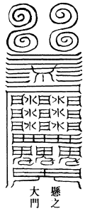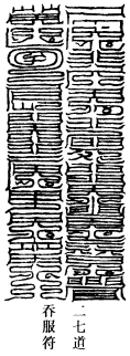 道言:道士当书神章,投泉绝厌,镇天下百魔之处,不问大小,转经行道,并上大驱杀宝章,口启吏兵。为此符,朱书。