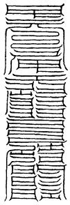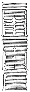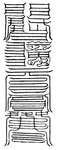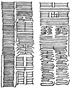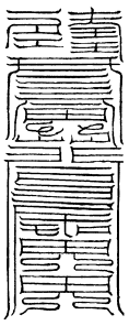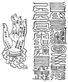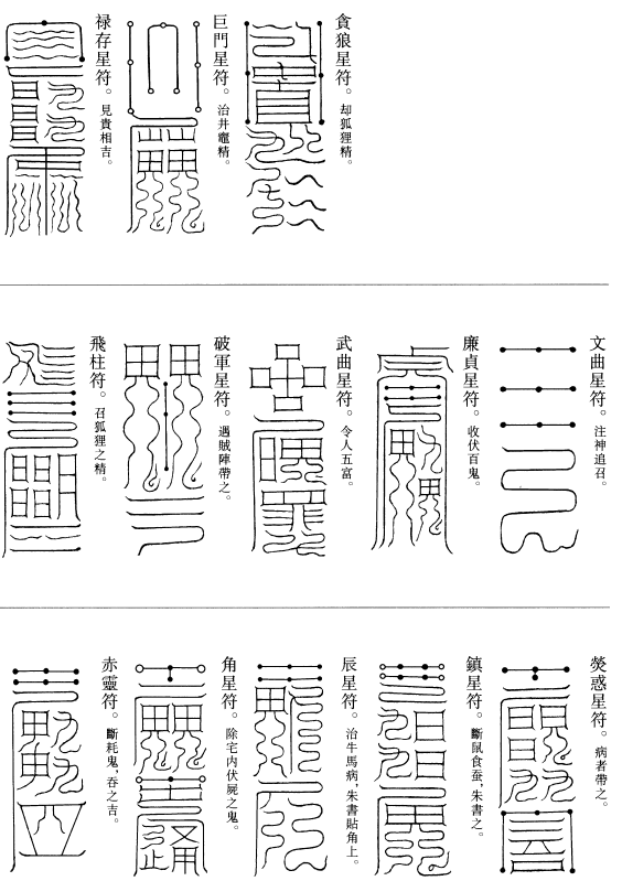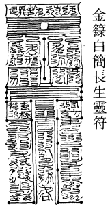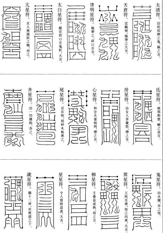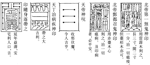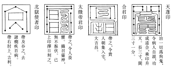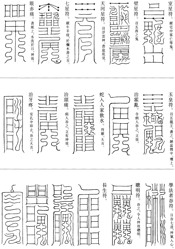 北帝曰:八字灵篆,若下元生人有疾在腹者,以墨书,水吞之一字,加持神咒。至此八字,即得消散。若疾在外者,当静思神力,以墨书其肉上且书第一字。若未消散,更於其侧书第二字,大都不过三字,无不退散。告诸真子,忆而奉行。