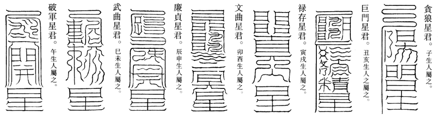 北帝曰:夫人五人,为勾销死簿。东斗主算君,为延寿益年。南斗真人君,为注上长生玉历。西斗记名君,为注上福禄。北斗星皇君,为落除死名。中斗太微君,为禳却灾祸,消诸不祥,所居安乐,鬼气消亡。若有强𦍙违道之者,并请收付魁罡之下,入地万丈。急急如律令。