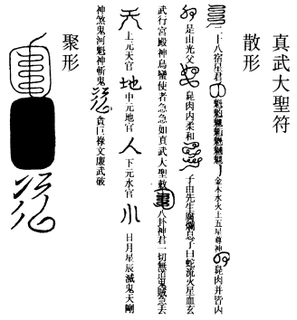 真武,身长百尺,散发,金鏁甲胄。足踏五色灵龟,又名螣蛇八卦之龟。按剑,立眼,如电光。凡用真武符,即取气,以为功曹注入笔头墨砚中,后以斗诀书之。左右执旗戟共九人,同乘黑云。