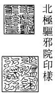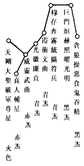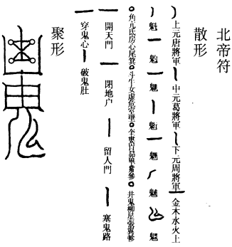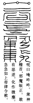 北帝有将,职主驱邪。神通广大,利爪长牙。威动天地,气若云霞。统领吏兵,驱使夜叉。后拥剑戟,前走雷车。威风戛地,走石扬砂。功赏正道,收捕精邪。为祸等鬼,尽底擒拏。急急如律令。出将居左。
