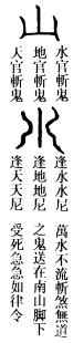 吾非凡之身,头似黑云,发如乱星,左目如日,右目如月,鼻如火铃,耳如金钟,上唇雨师,下唇风伯,牙如剑树,十指如功曹。敕吾左肋岷山君,敕吾右肋庐山君,敕吾左足左雷将军,敕吾右足右电将军,敕吾脊骨泰山君,三十六禽,二十八宿,并应吾身,急急如律令。