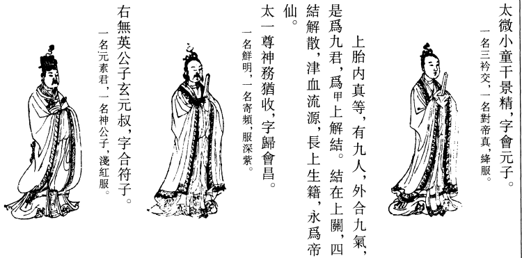次引太极紫房,并北面对太帝君,而各长跪,其言曰:上关雕梁际等九人,中关太一务犹收等九人,下关下一黄庭始明精等九人,三九二十七人,即日缘气内咽,上开三关,关有二十四结,结有二十四筋,筋即已断,结已解散,津血上冲,径满泥丸,玉液下顺,哺养百神,即日某甲名上帝籍,长生神仙。毕,又存太一召兆,上诣帝君前。帝君曰:胞结已通,光内彻外,使尔长生,命不倾坠,汝可合我形中矣。帝君因开口,觉我忽入帝君口中,径到帝君六合宫中。帝君六合宫中,又有太上神,名重冥空,字幽寥无,因告兆曰:可食日精矣。兆即取日精食之,作九咽止。须臾,见向二十七真人,皆在兆左右立。二十七真人曰:某甲胎籍已解,秽气皆除,面已玉泽,体洞太虚,长生亿万,帝君同符。又存帝君祝曰: