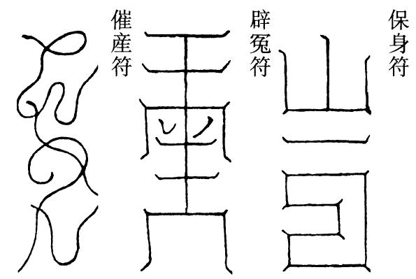 是时天尊说经既毕,诸仙大圣来迎天尊,巡游他方,济拔群品,再为国王、后妃曰:自后依奉正道,即生孝慧之男。吾今付汝灵符三道,朱书吞之。一符保身,一符辟冤魂,一符催速生。汝等可以教世人遵敬奉行。